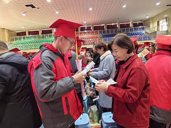 最令人动容的环节如期而至。家长们亲手为孩子戴上成人帽,象征着责任的传承与爱的延续。随后,亲子双方互换信件,拆开那封尘封着牵挂与鼓励的家书,字里行间的深情让不少同学热泪盈眶。